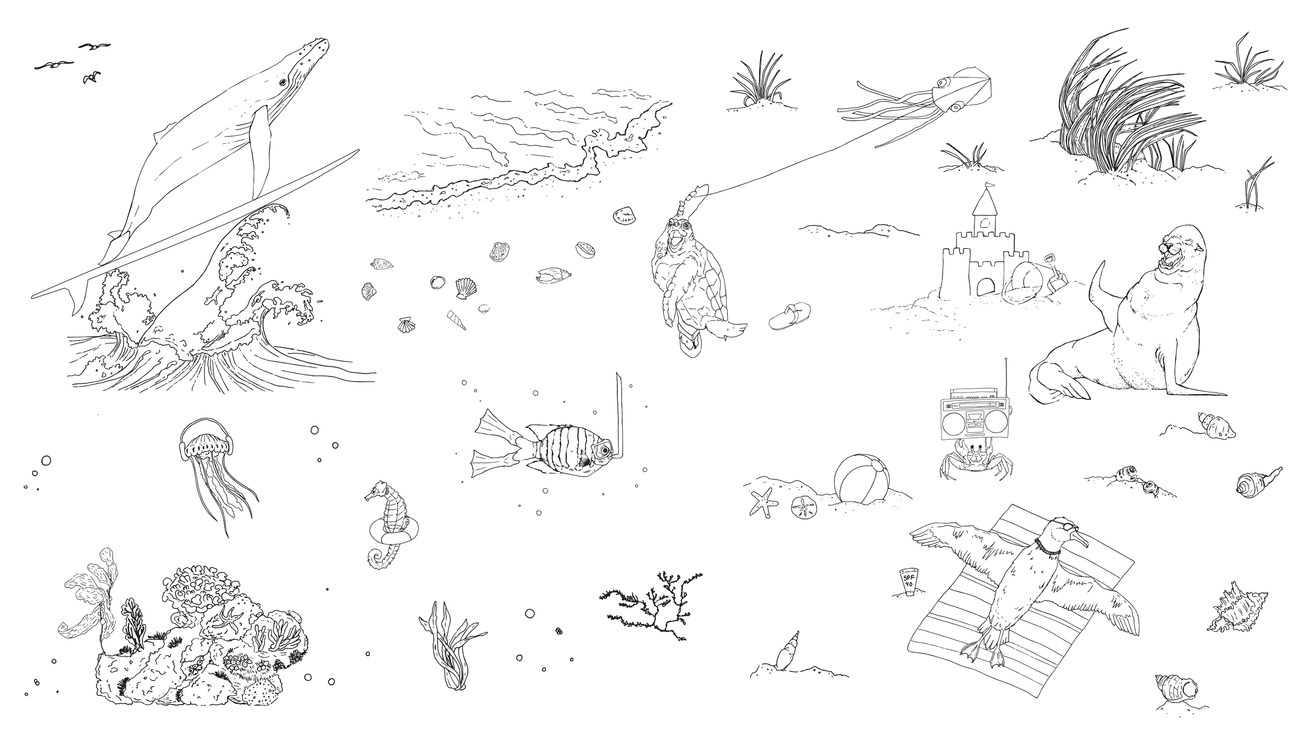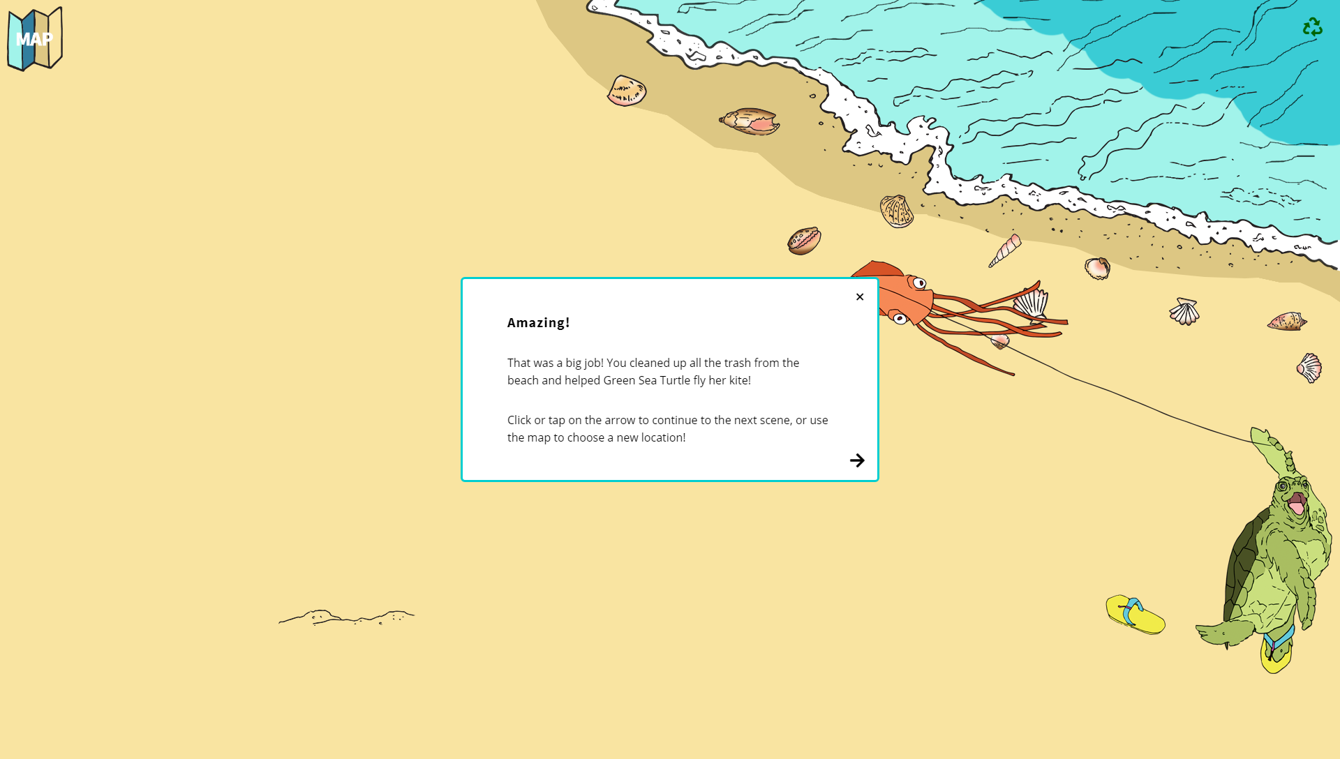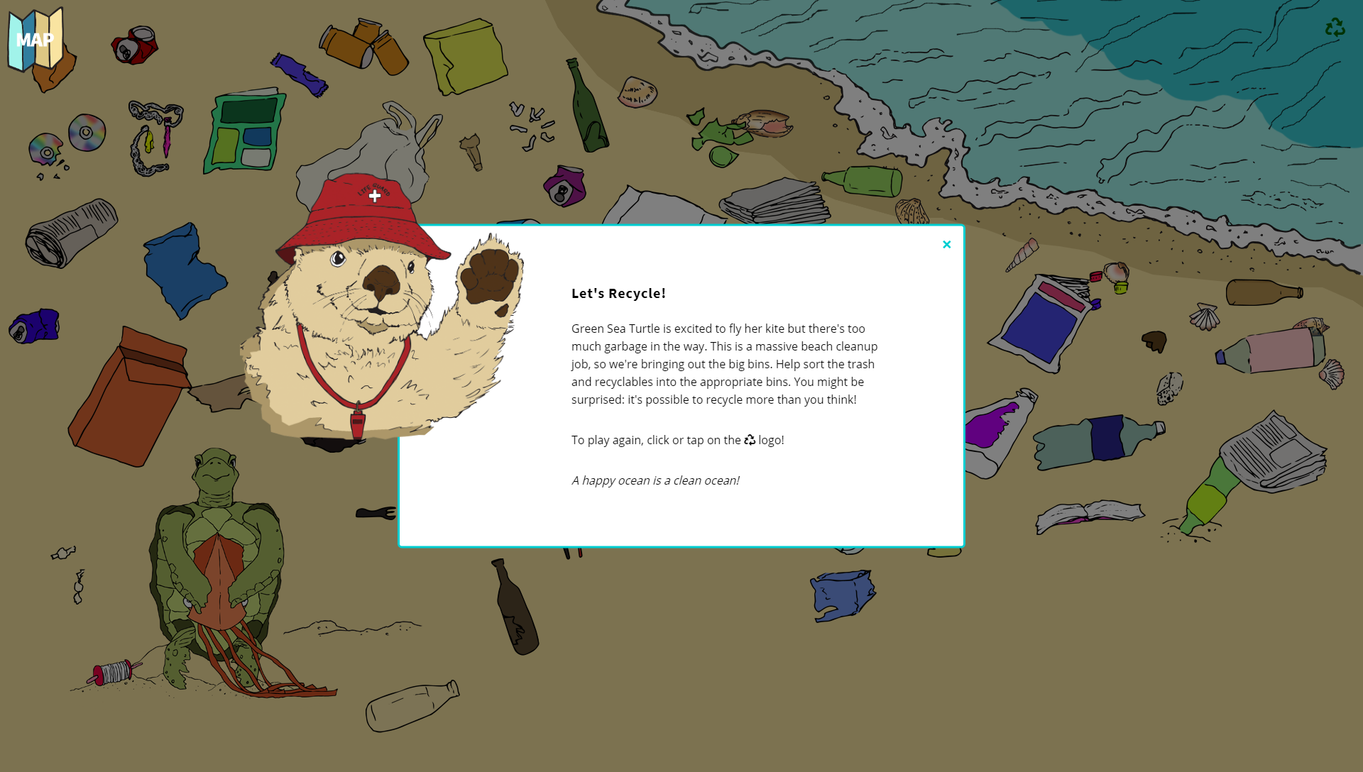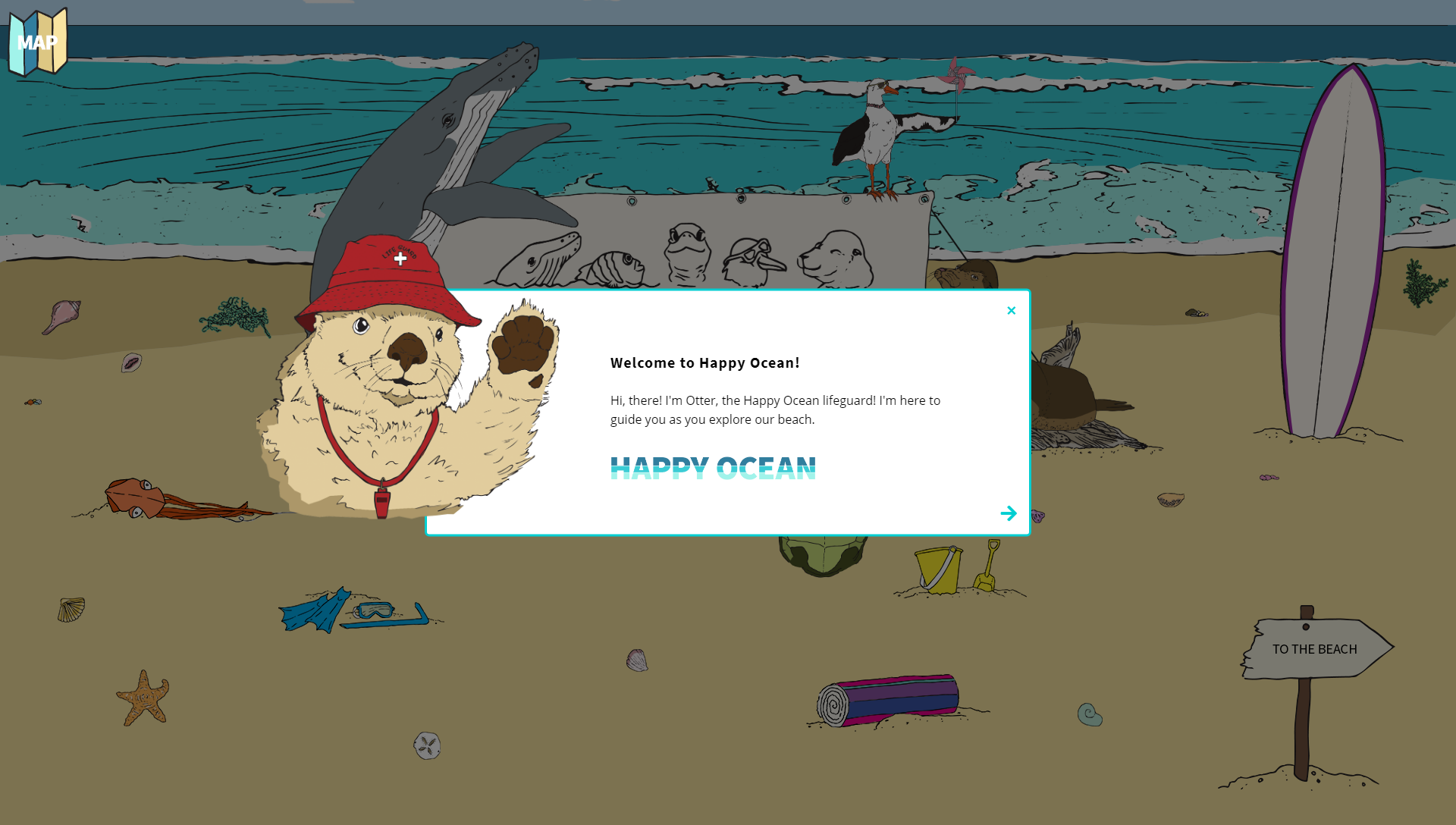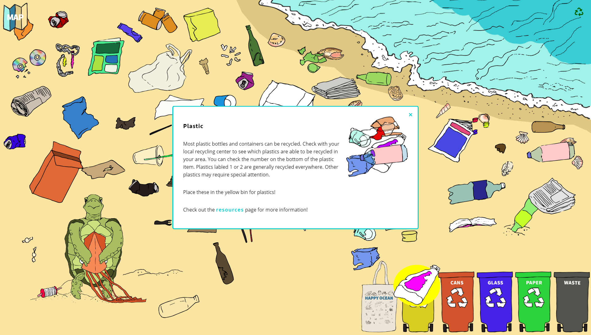 Happy Ocean is an interactive website that addresses the effects of plastic pollution on marine animals. The website tells the story of five ocean animal friends who meet for a beach cleanup party. There are several scenes on the beach that tell stories about the experiences of these mascots living with plastic in the ocean. By interacting with the characters and images in each scene, visitors can learn about the impact of plastic pollution and discover ways to help clean up our ocean.